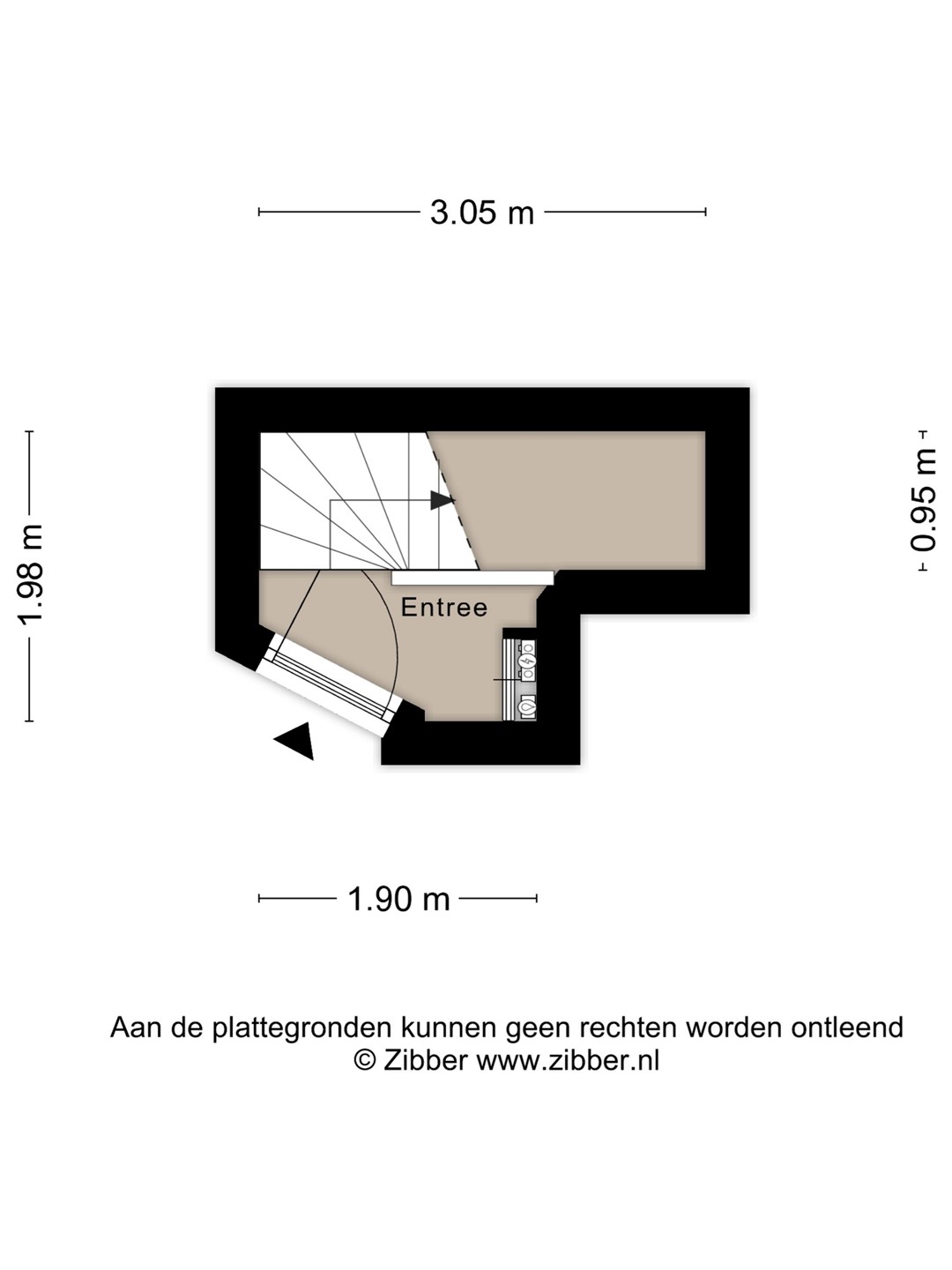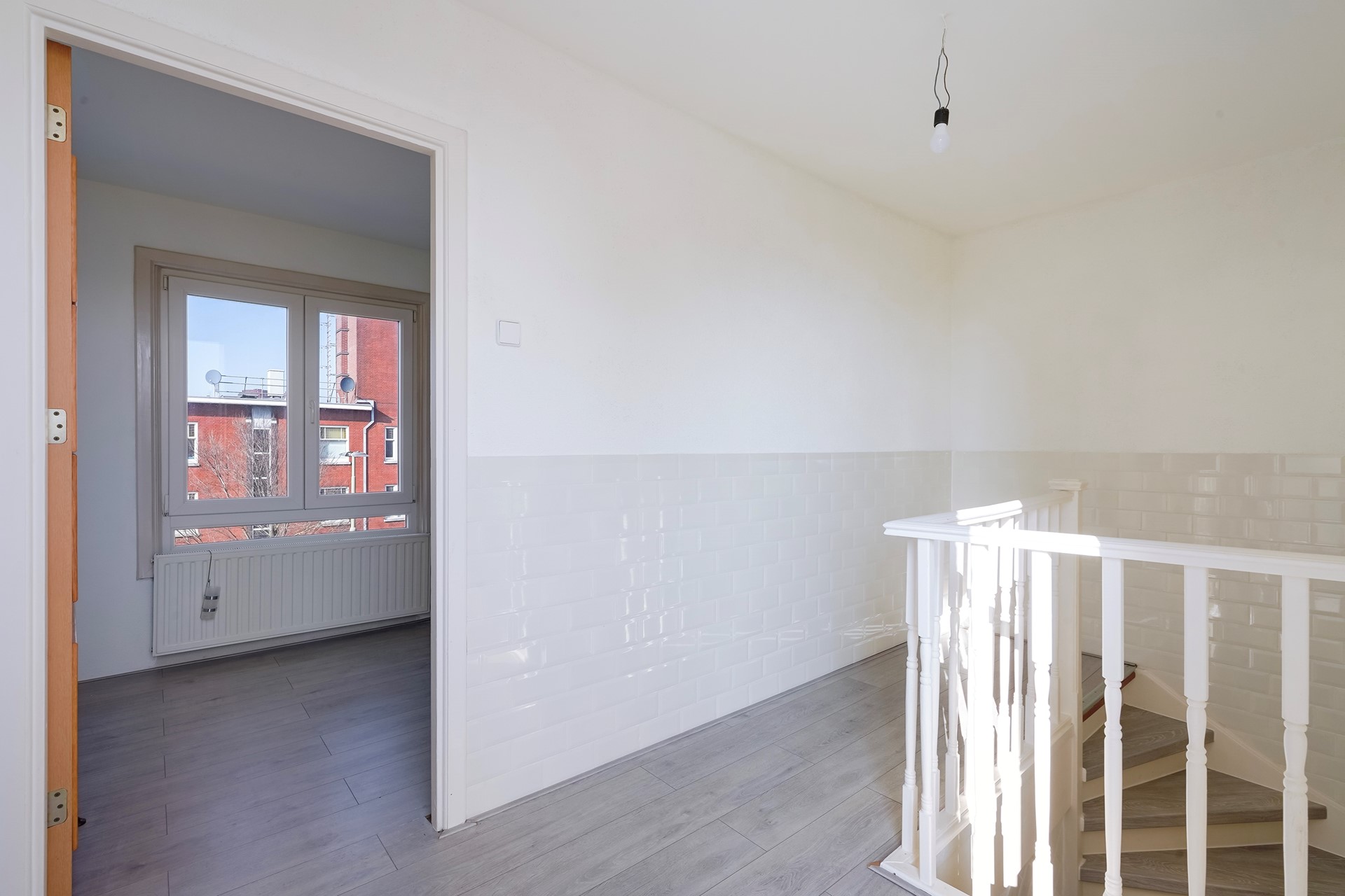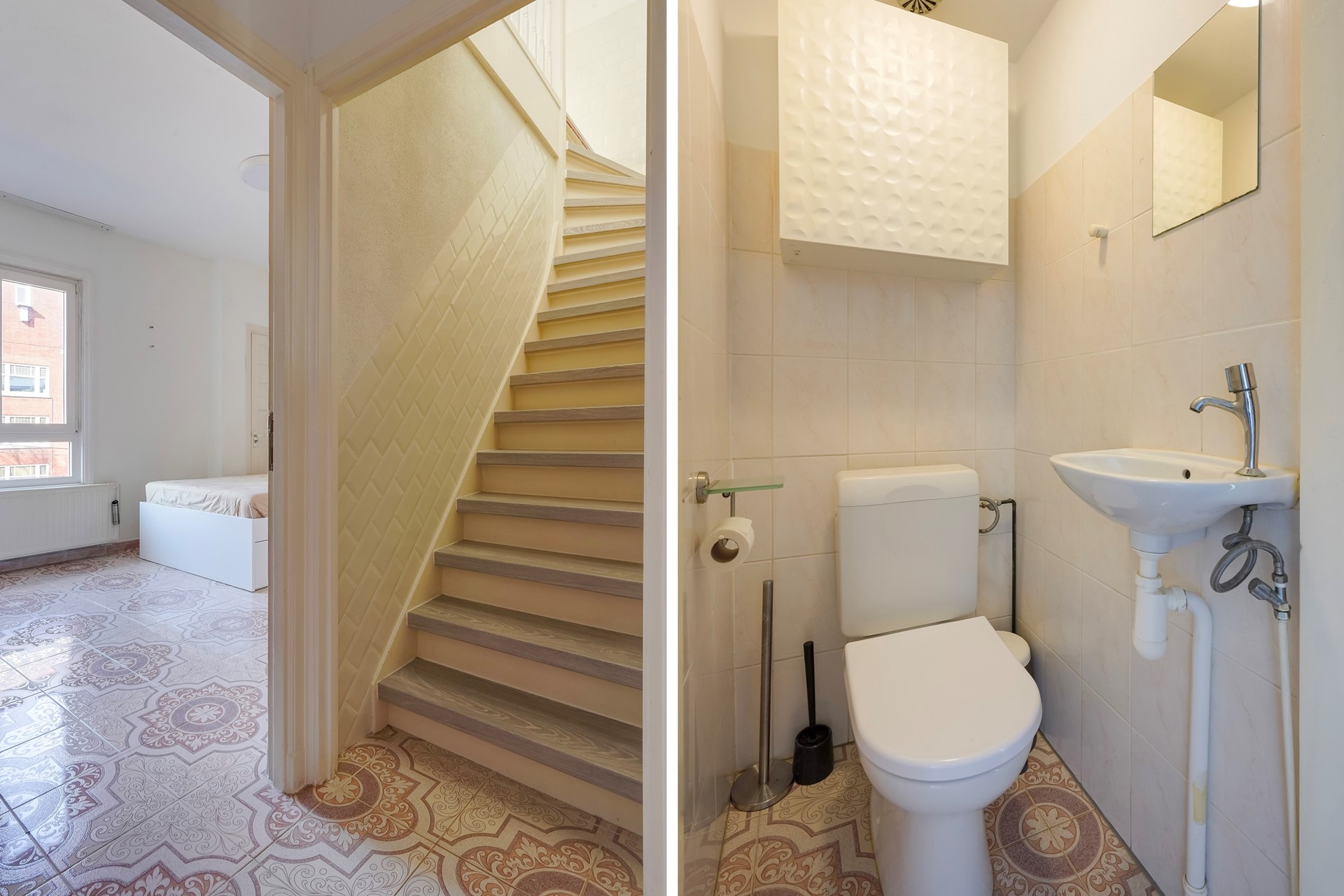 Aan de voorzijde bevinden zich de slaapkamer en de woonkamer. Op de overloop naast de trap naar boven het toilet.