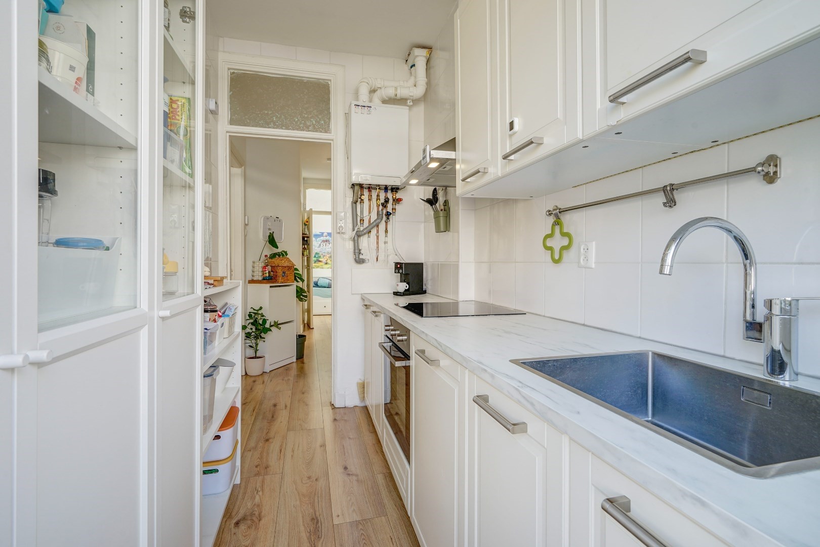 Nette keuken met inductie kookplaat, vaatwasser, opstelplaats CV-combiketel en toegang tot het balkon.