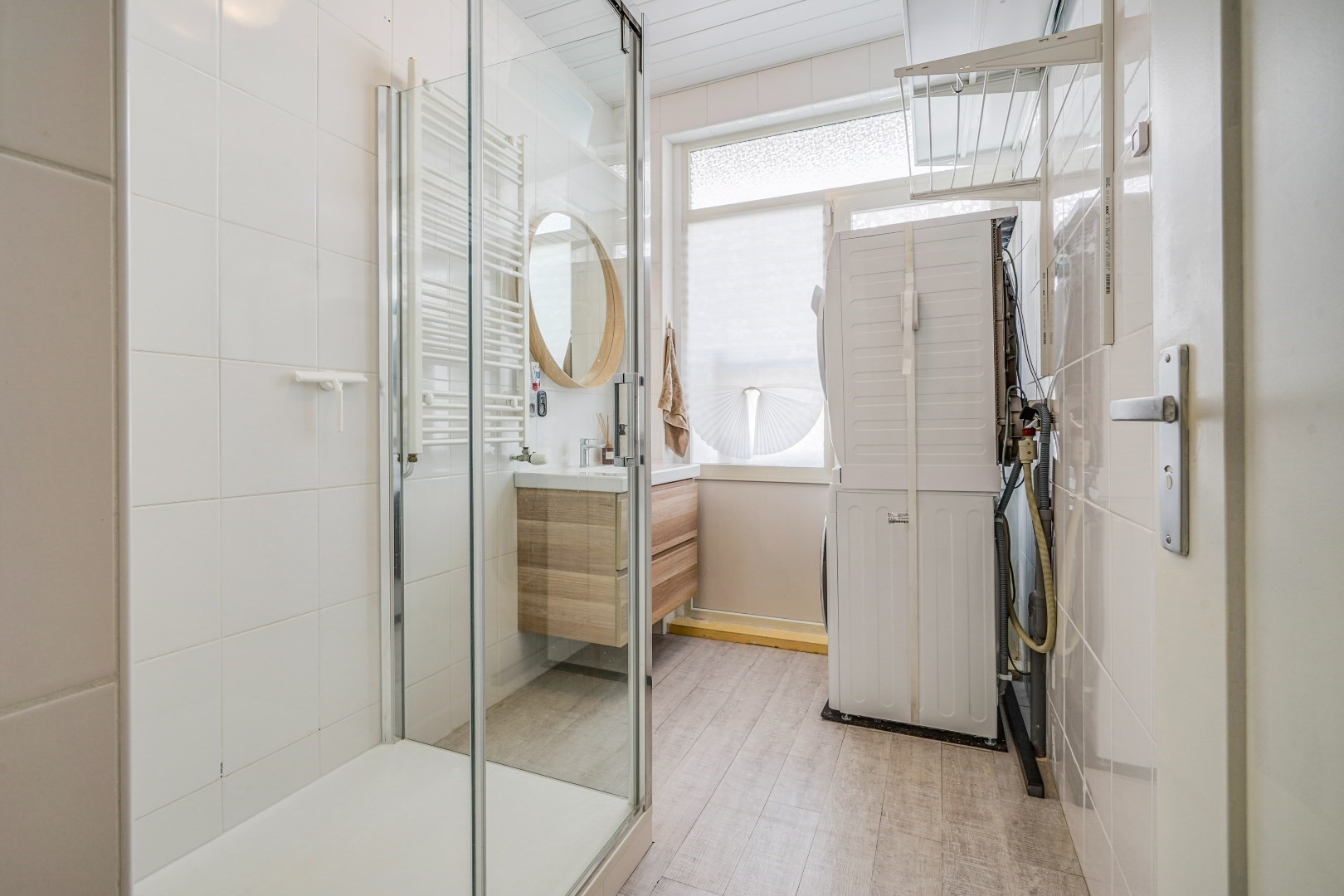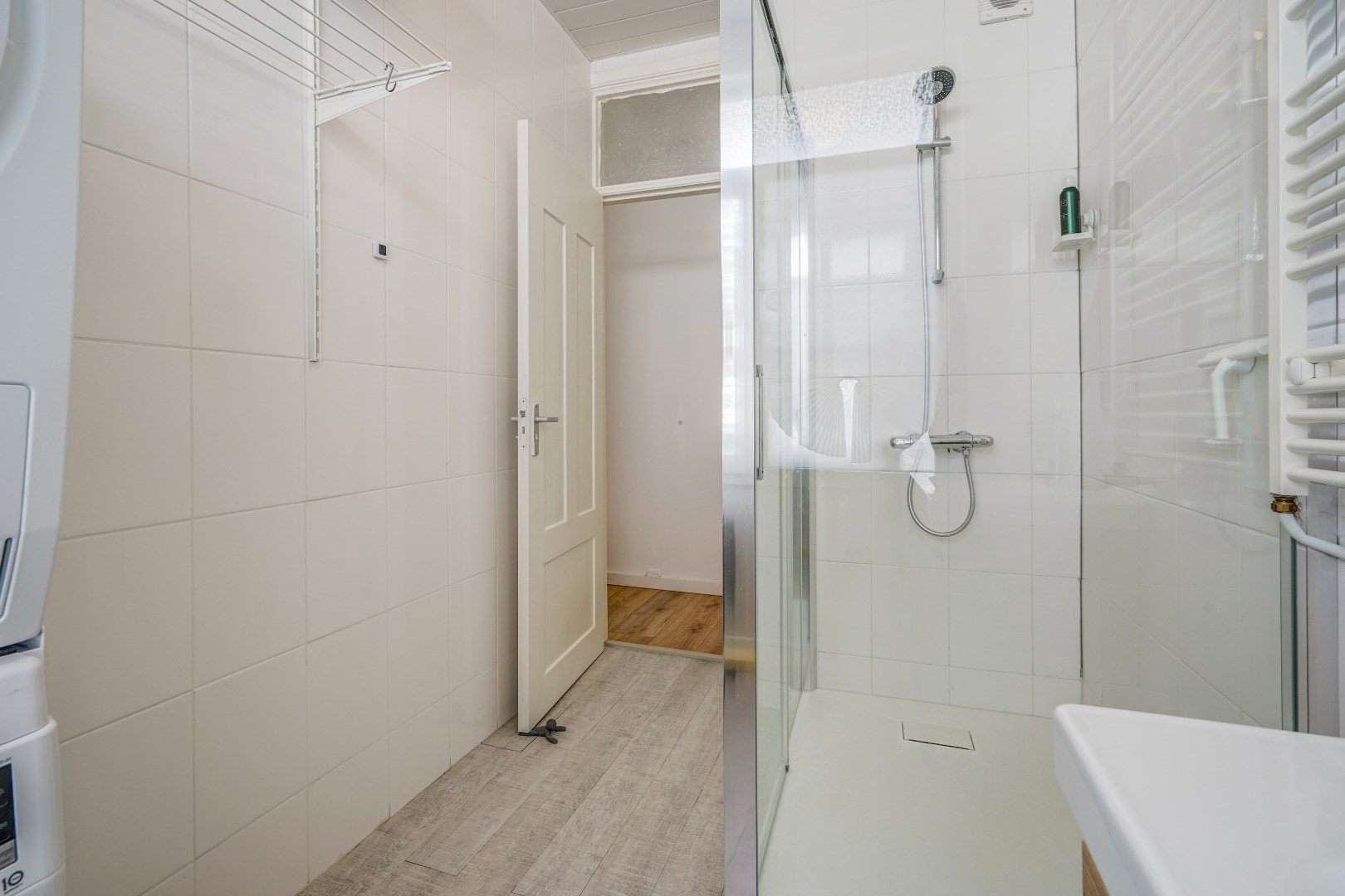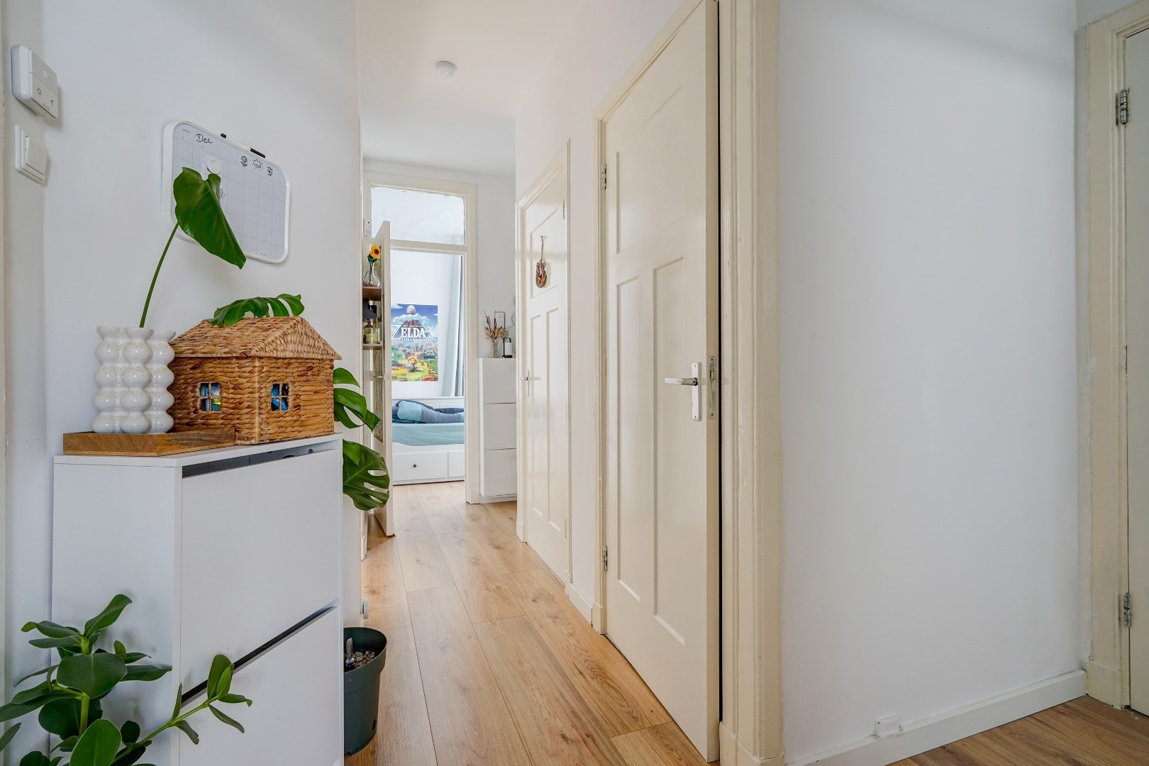 Open portie: trap naar eerste etage, entree woning L-vormige gang, meterkast, toilet. zeer lichte woon-eetkamer, royale slaapkamer achterzijde, slaap voorzijde, badkamer met douche, vaste wastafel en opstelplaats wasmachine-droger.