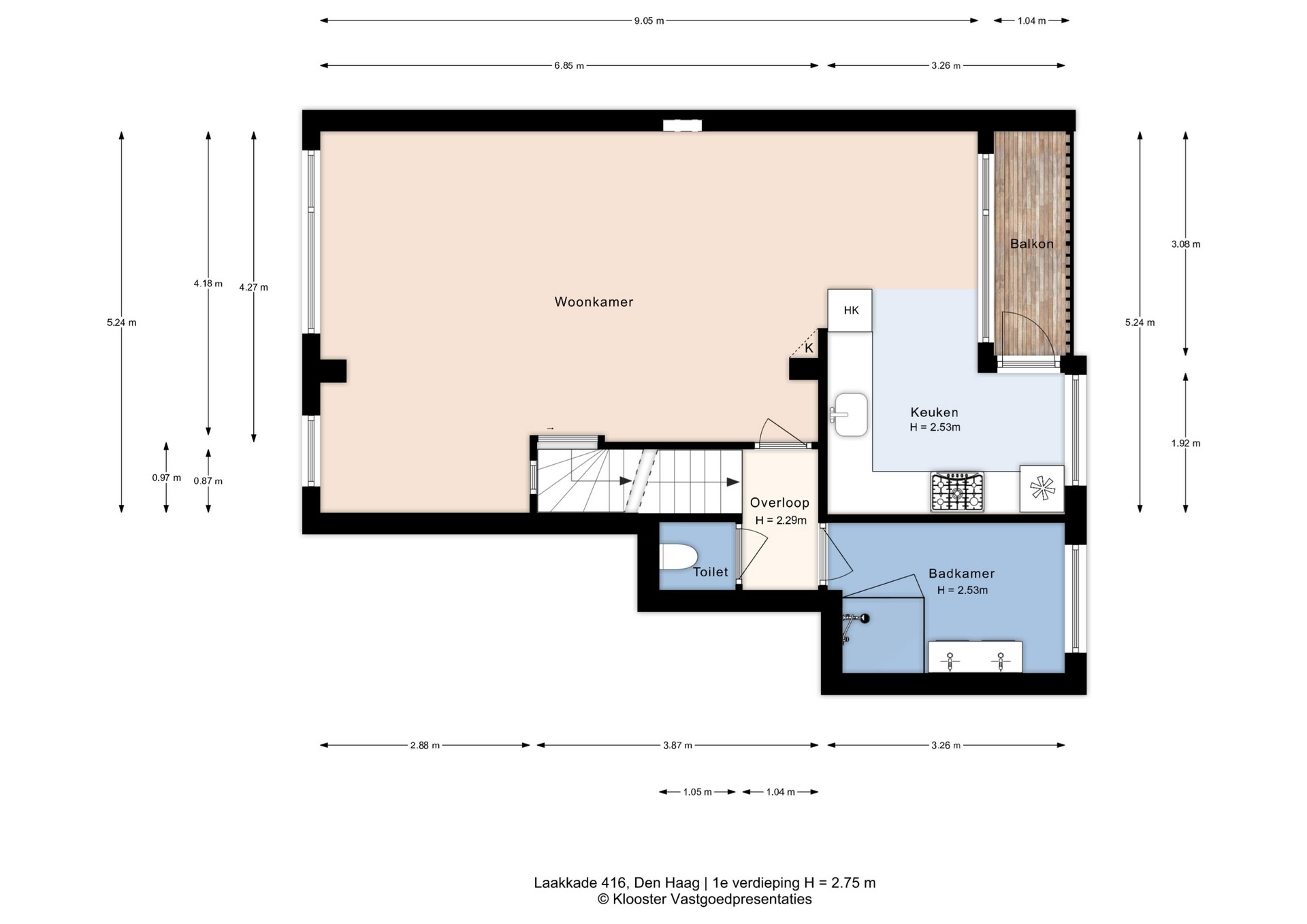 De afmeting van de woonkamer is 9,05 x 5,10, keuken 3,26 x 2,00 vanuit de keuken toegang tot het zonnige balkon 3,80 x 1,50.
