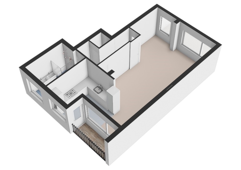 De entree van de woning bevind zich op de begane grond, na de trap is de overloop die toegang biedt tot het toilet, de woonkamer met deels open keuken en de badkamer. Op de 2de etage bevinden zich de ruime overloop, twee slaapkamers en het royale dakterras over de gehele breedte van de woning. De 3de etage heeft overloop en een slaapkamer.