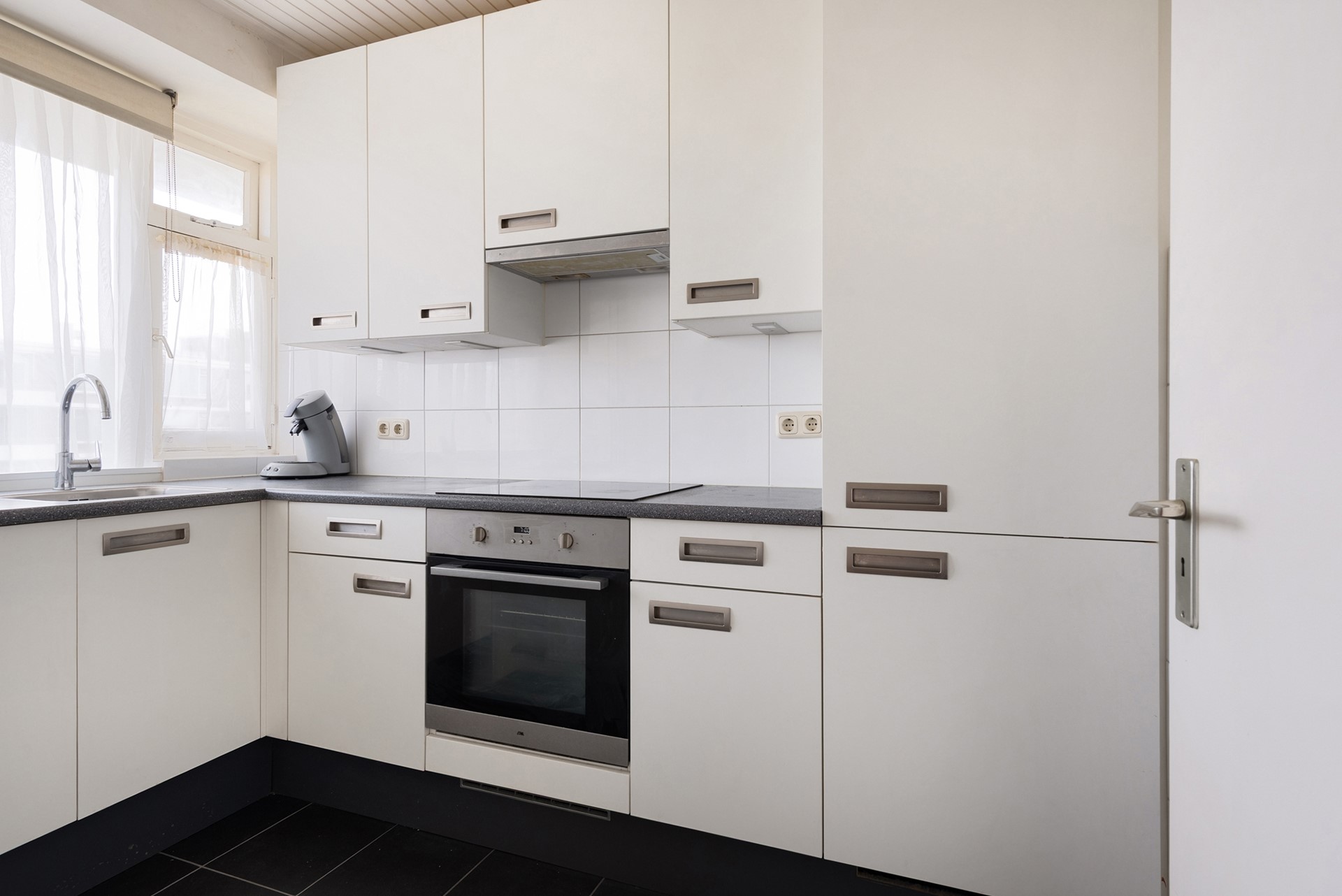 Moderne lichte L-vormige keuken aan de galerijkant met diverse inbouw apparatuur inductie kookplaat, oven, koel vries combinatie, vaatwasser.
