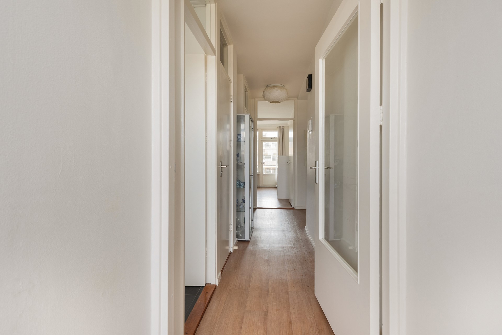 Entree, je komt binnen via het afgesloten entreeportaal met brievenbussen, bellentableau en intercom. Er zijn twee liften en trappenhuis, de appartementen worden per verdieping ontsloten middels een galerij. dit appartement is rustig gesitueerd op de zesde verdieping. Je komt de woning binnen in een afgesloten entree, en vervolgens in de hal 8.3m² in de hal is er een apart toilet met fonteintje beschikbaar, via de hal kom je in de lichte woonkamer die aan de achterzijde is gelegen 21.5m², en geniet van veel daglicht door de gunstige ligging op het Zuidwesten. Vanuit de woonkamer kijk je op het groen. Slaapkamer achterzijde 13.5m² met toegang tot het zonnige balkon ZW, twee slaapkamer galerijkant respectievelijk 12.7m² en 8.6m².