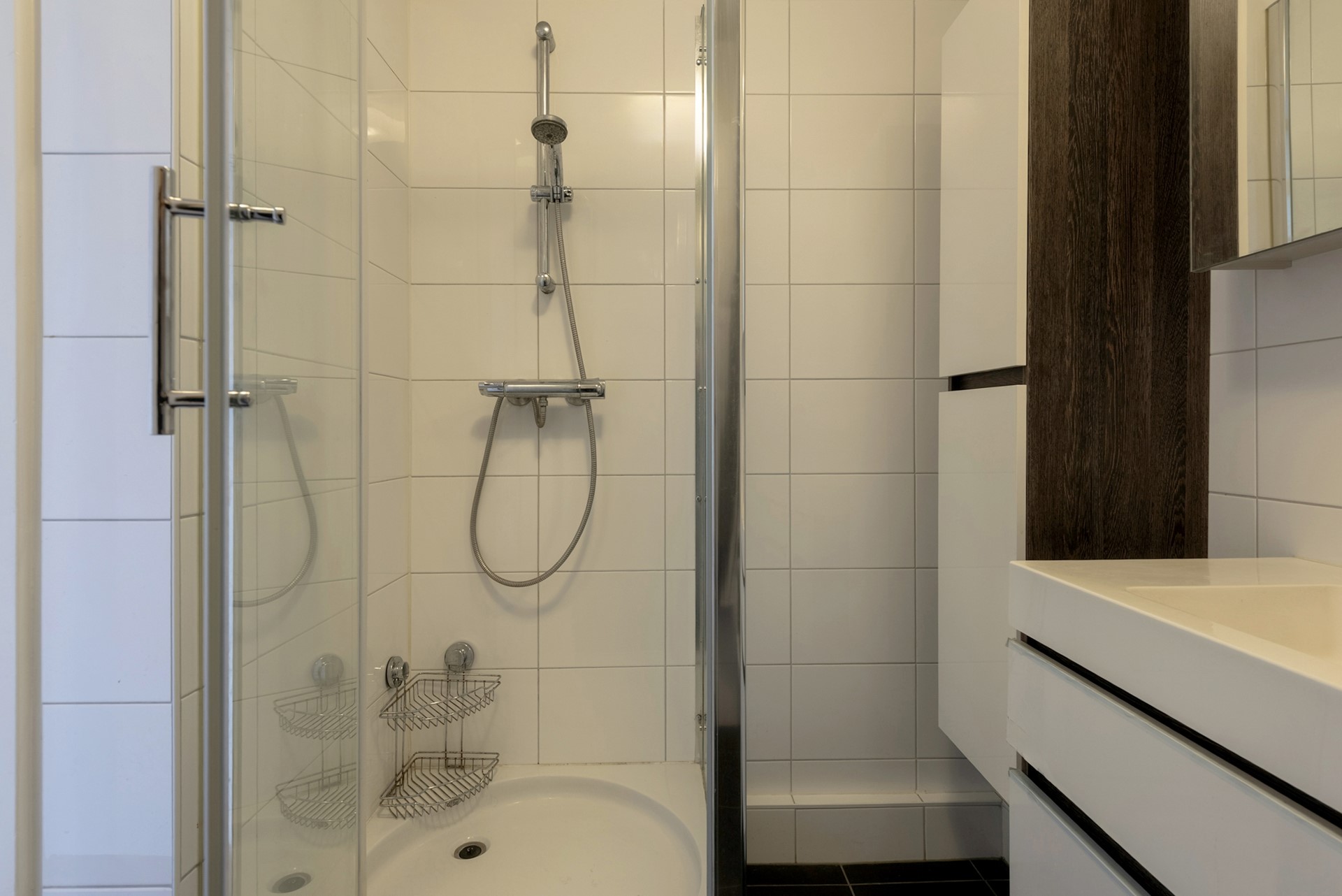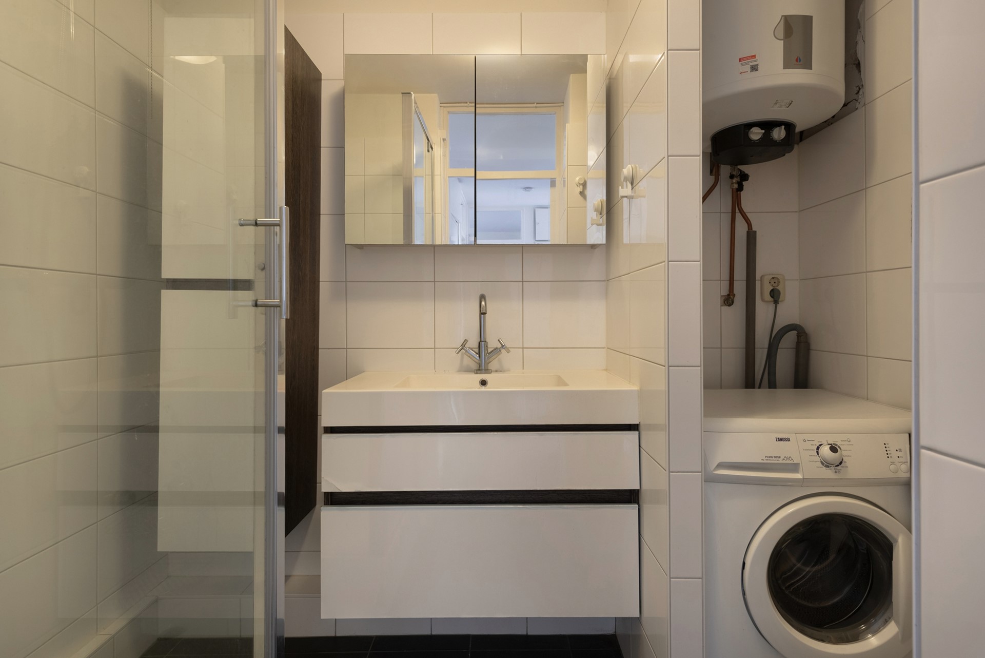 Moderne lichte badkamer met douche, wastafelmeubel en opstelplaats wasmachine en boiler.