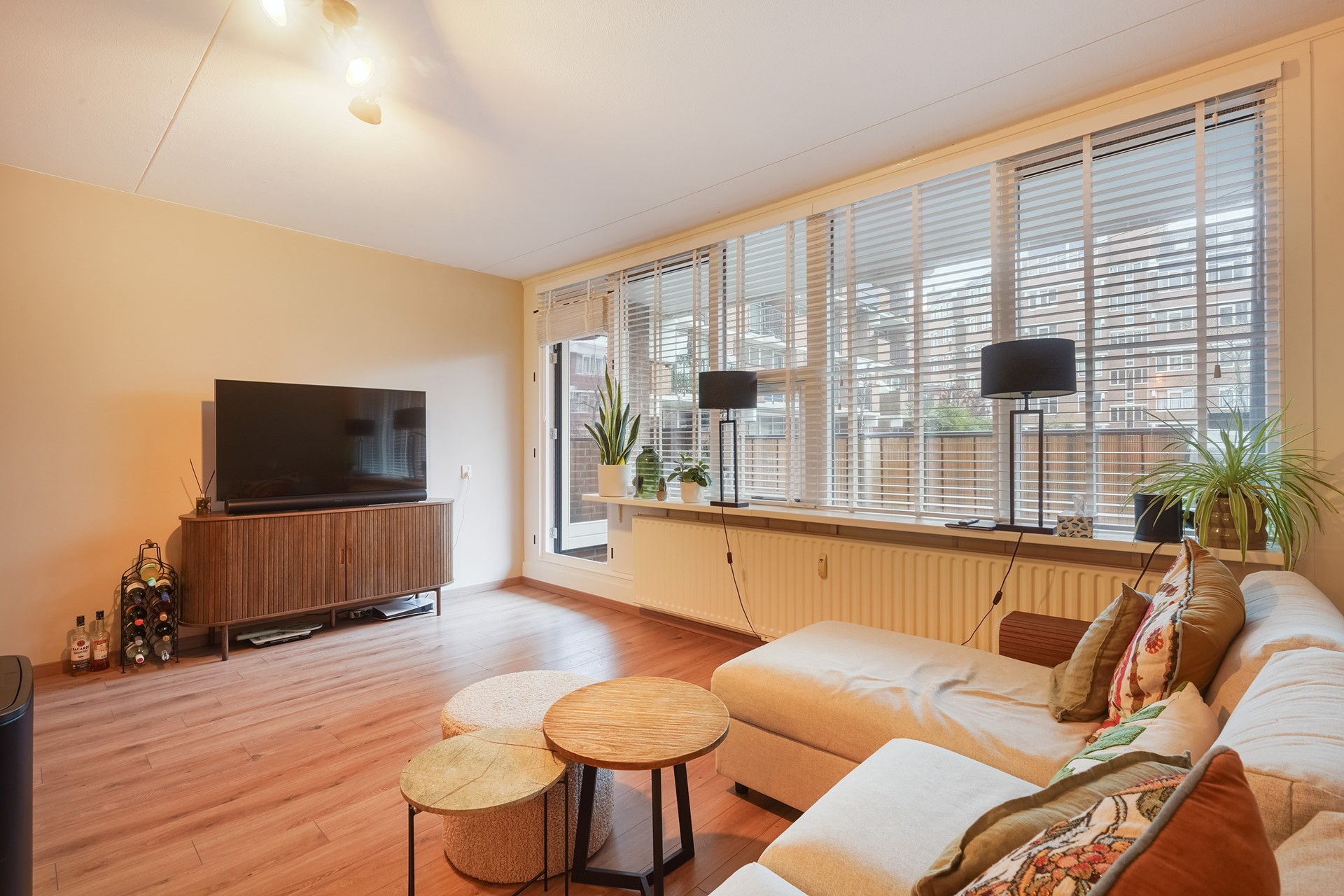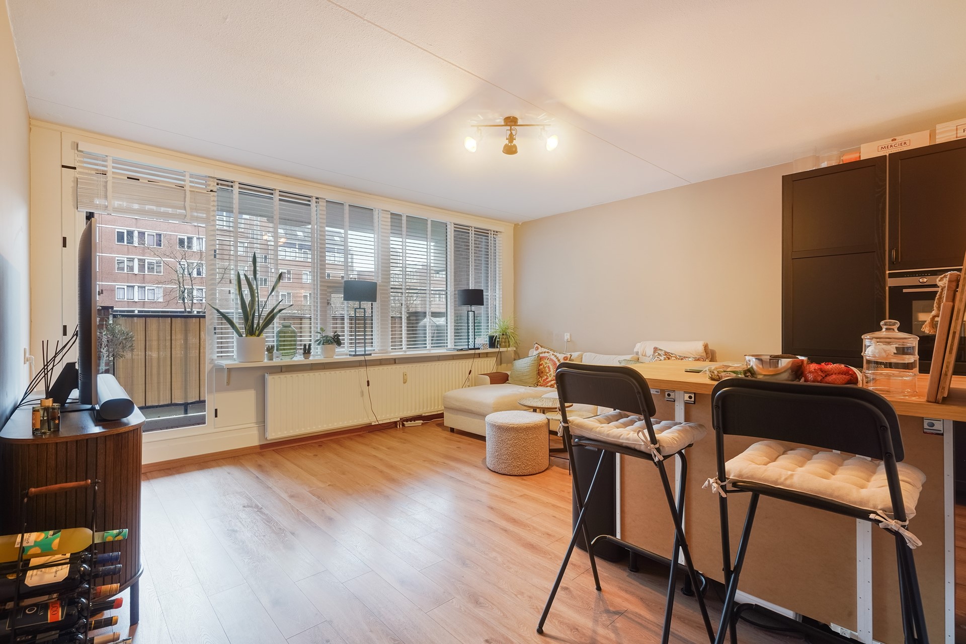 De lichte woonkamer met open keuken vormt het hart van het appartement. De keuken is voorzien van diverse inbouwapparatuur en biedt direct toegang tot het zonnige balkon op het zuiden, een heerlijke plek om tot in de avond van de zon te genieten.