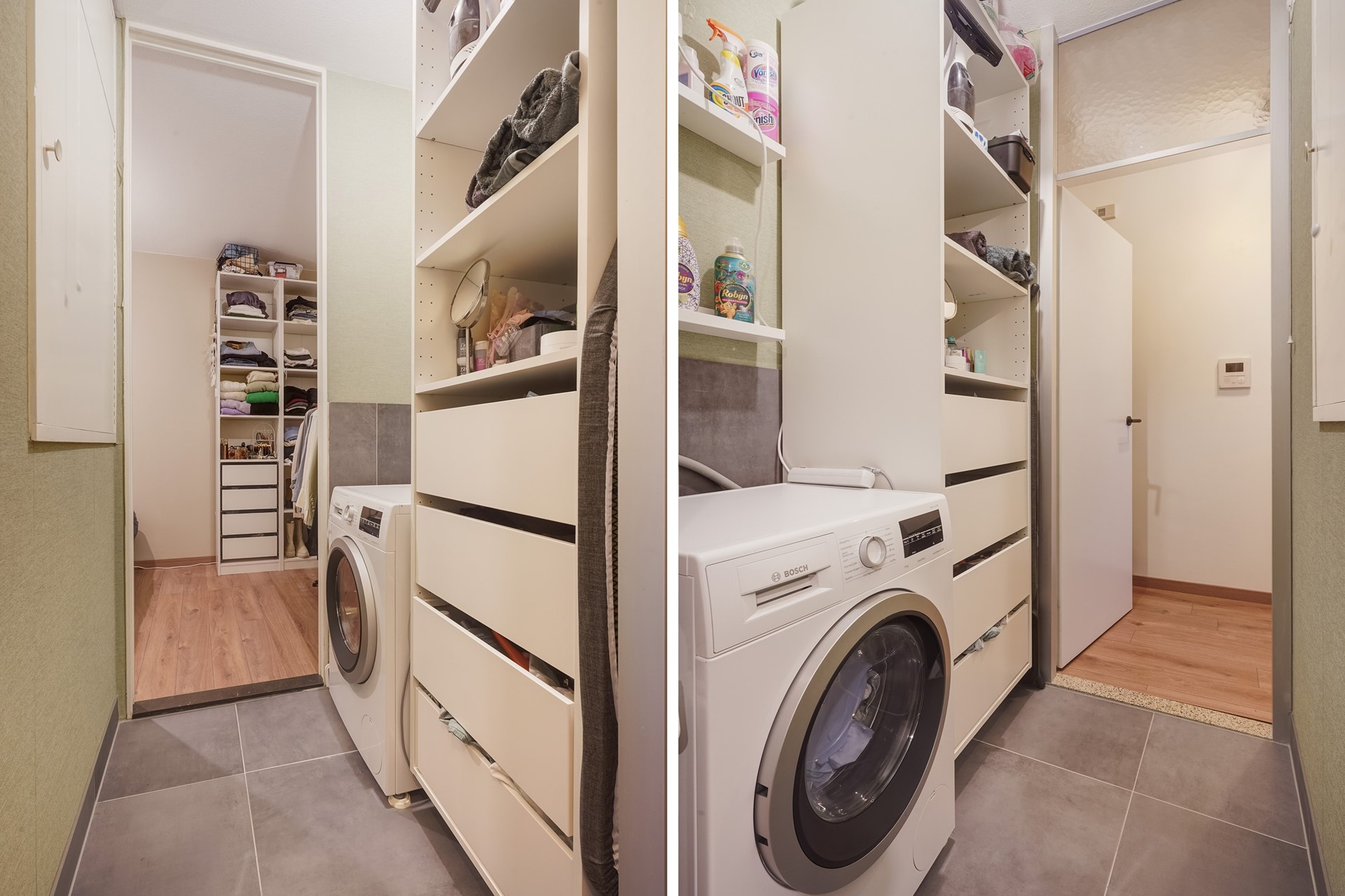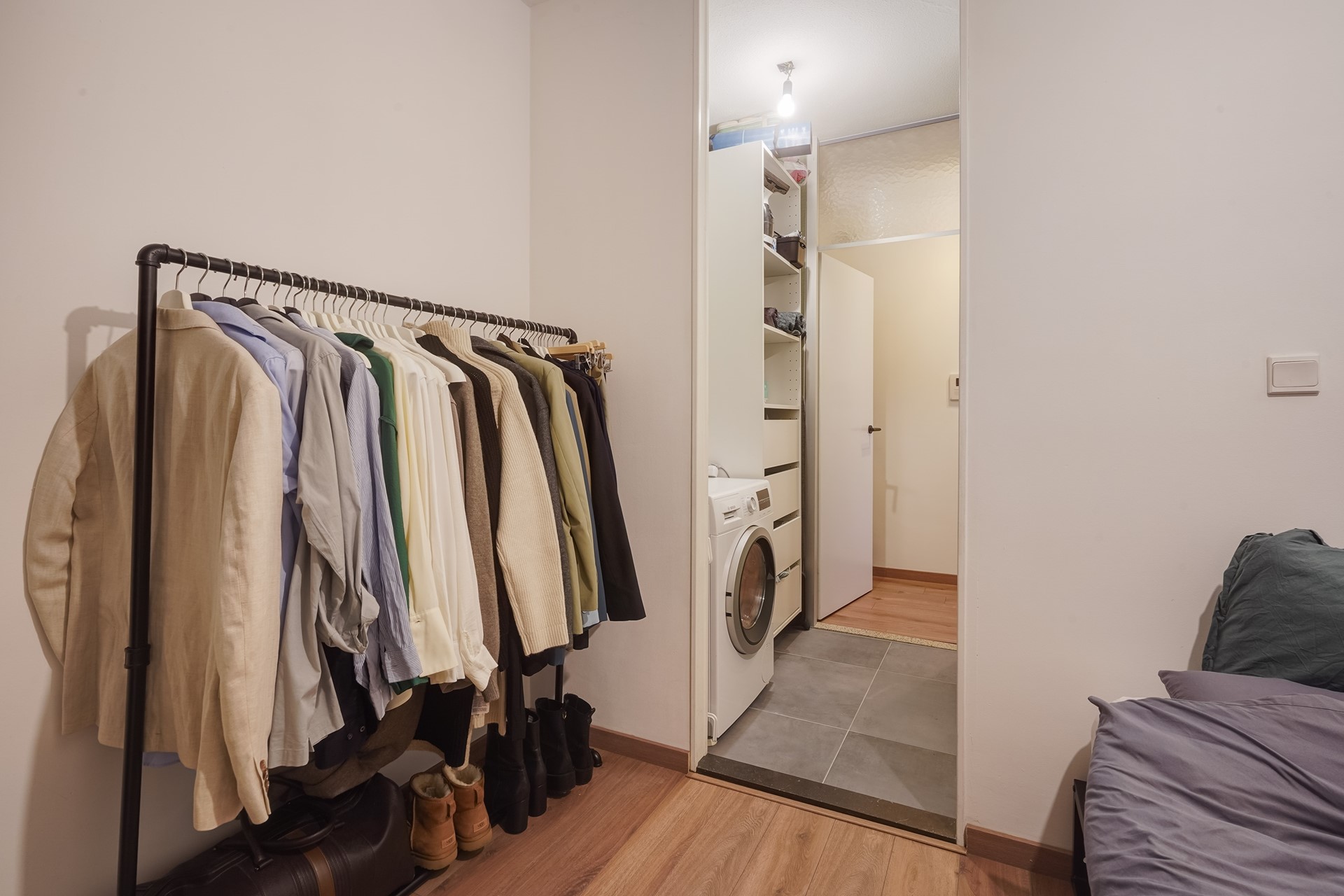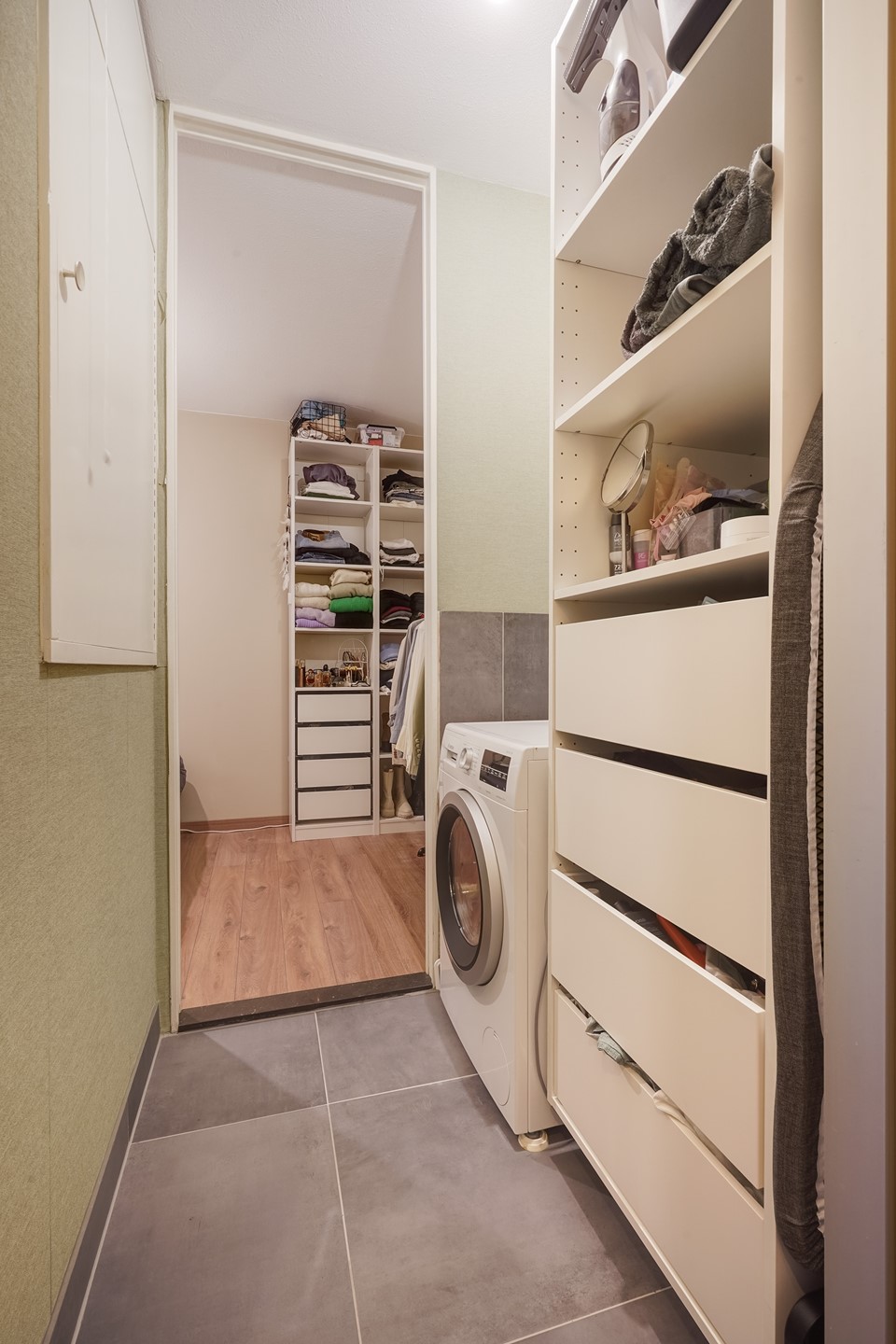• een praktische tussenhal met vaste kast en wasmachineaansluiting