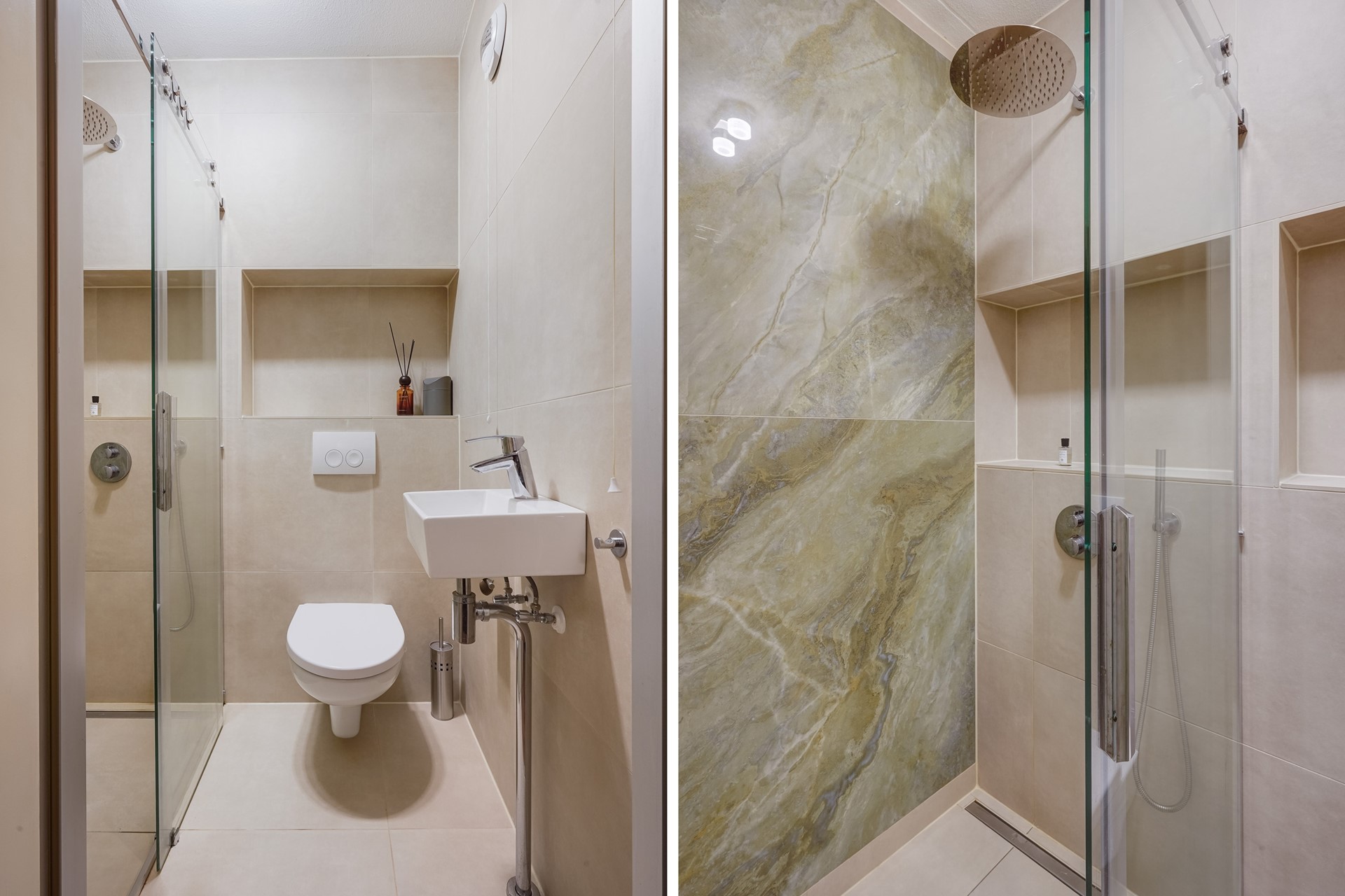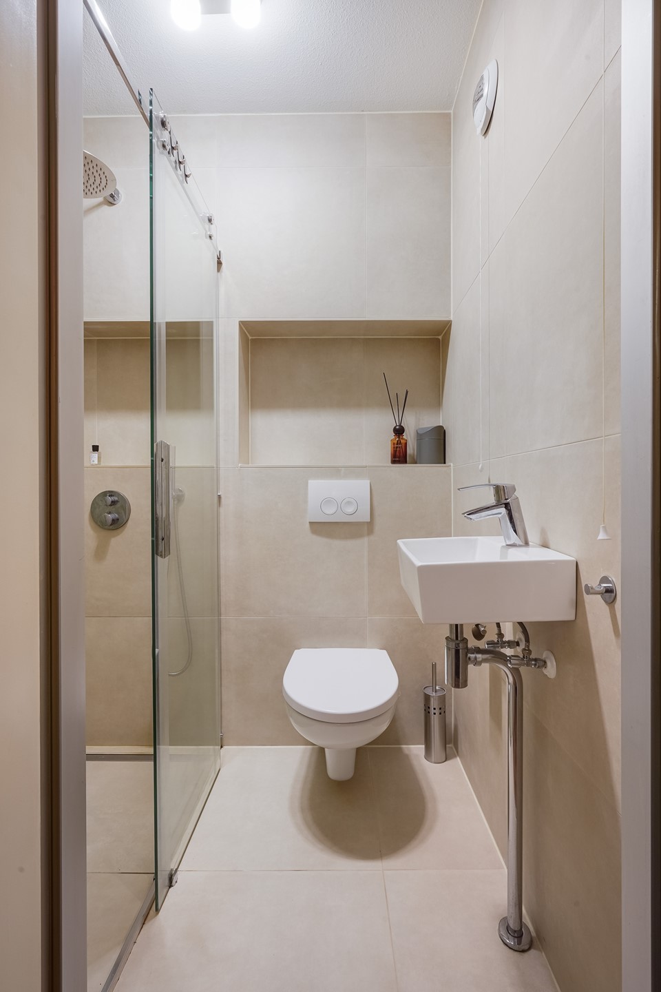 • een nette badkamer met douche, vaste wastafel en toilet