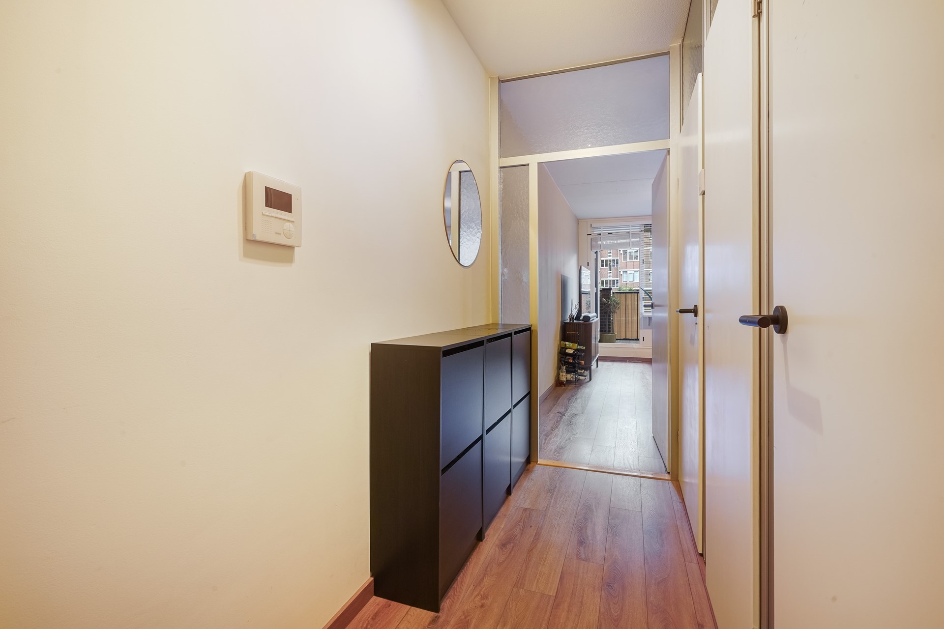 Afgesloten portiek met bellentableau en trappenhuis.